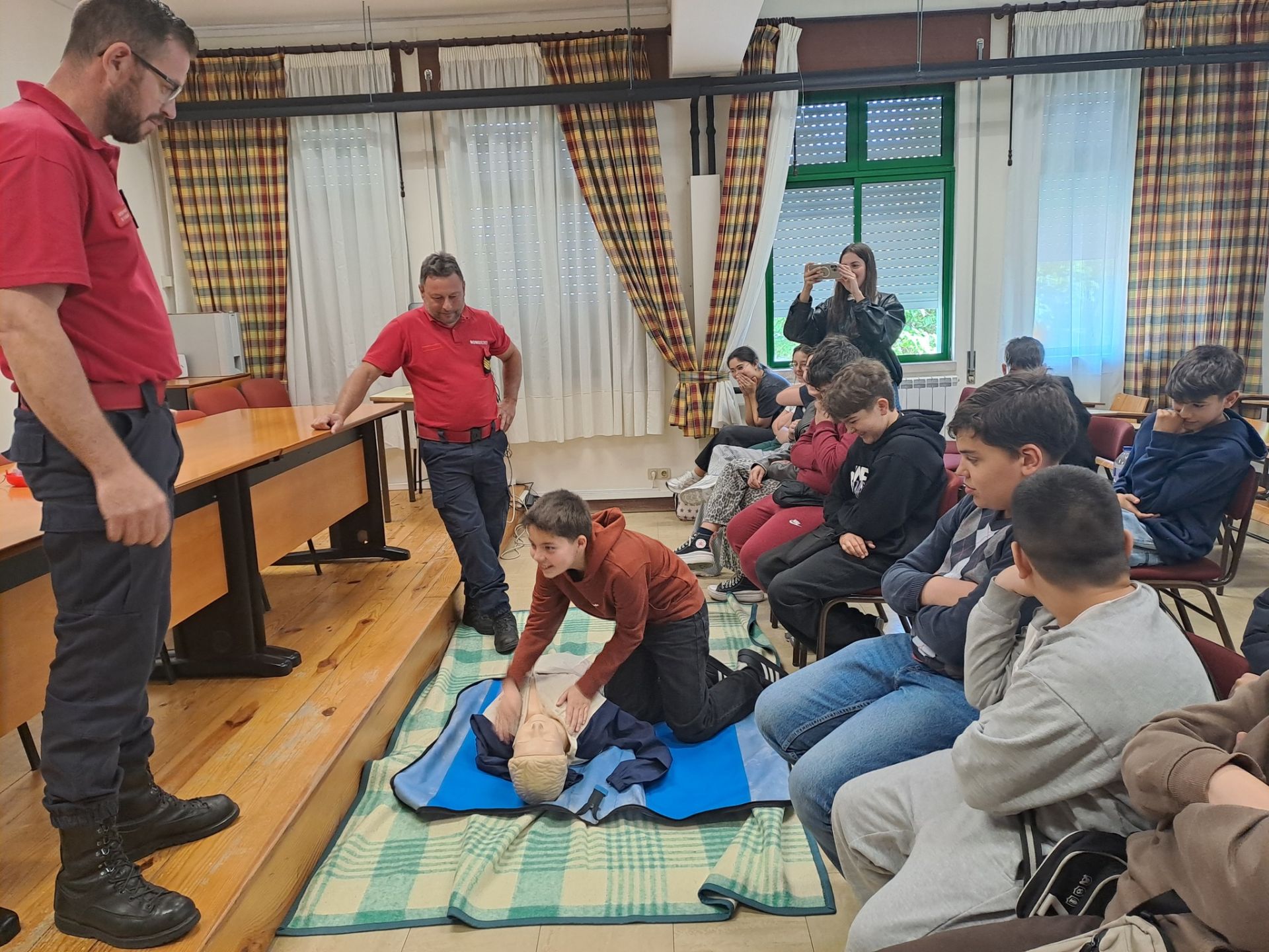 Após receberem formação com os profissionais, os alunos praticaram as técnicas ensinadas, consolidando conhecimentos essenciais para situações de emergência.