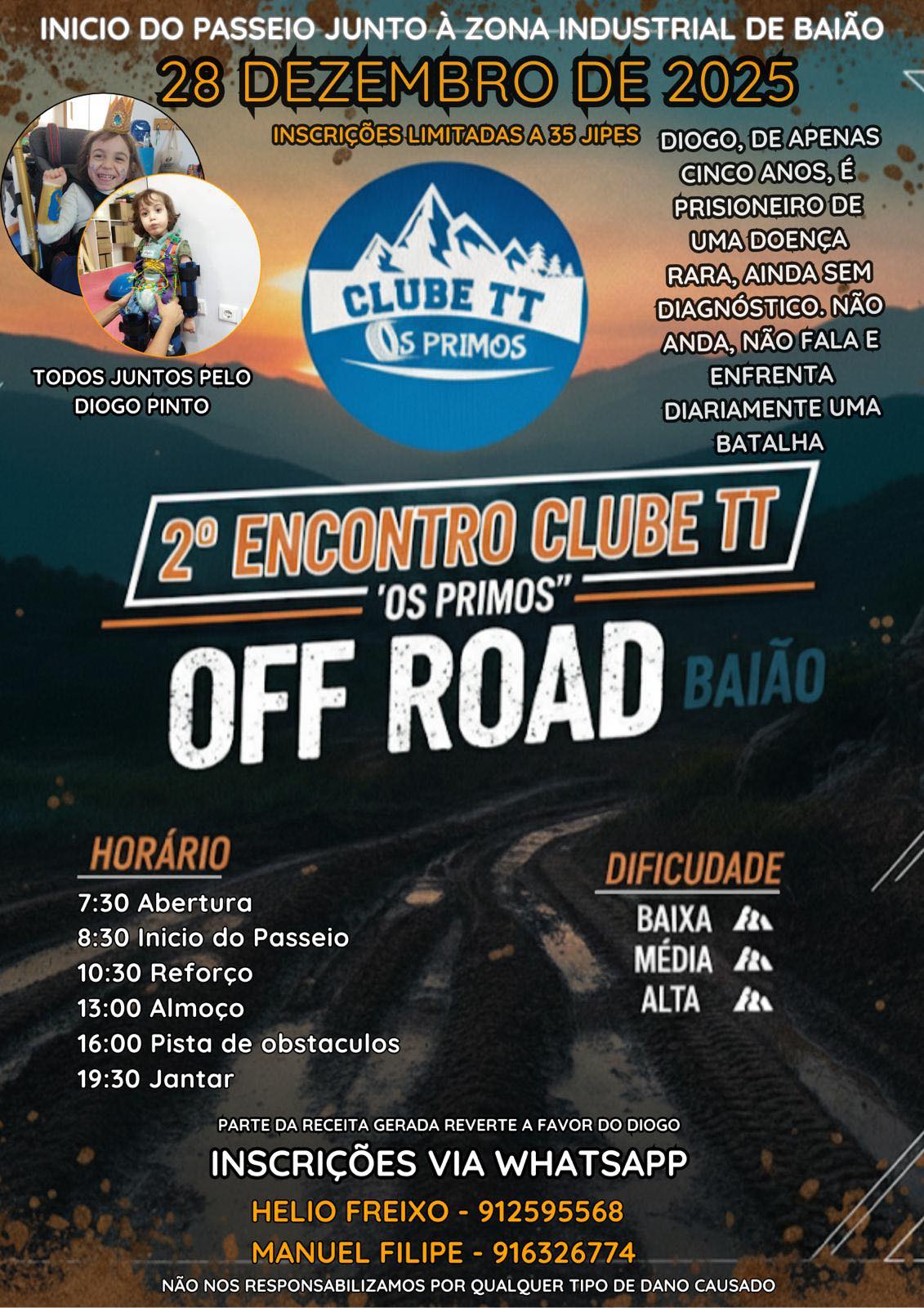 A iniciativa, cujo percurso tem início junto à Zona Industrial de Baião, contará com a participação limitada a 35 jipes e tem como principal objetivo apoiar o jovem Diogo Pinto, que enfrenta uma doença rara ainda sem diagnóstico.