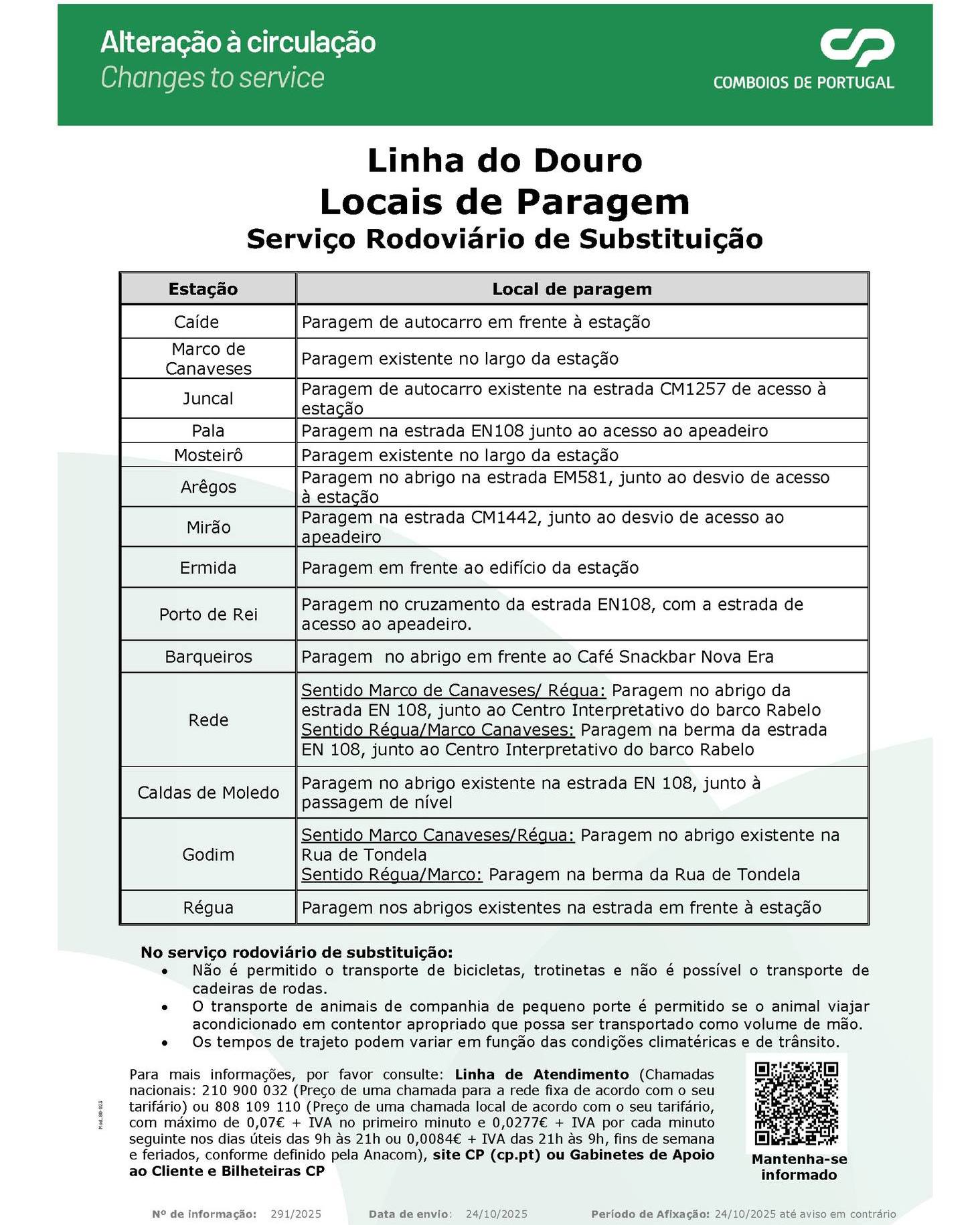 Para informações adicionais, horários e eventuais alterações, os passageiros devem consultar o site da CP (www.cp.pt), o Linha de Atendimento 210 900 032 ou os Gabinetes de Apoio ao Cliente e Bilheteiras CP.