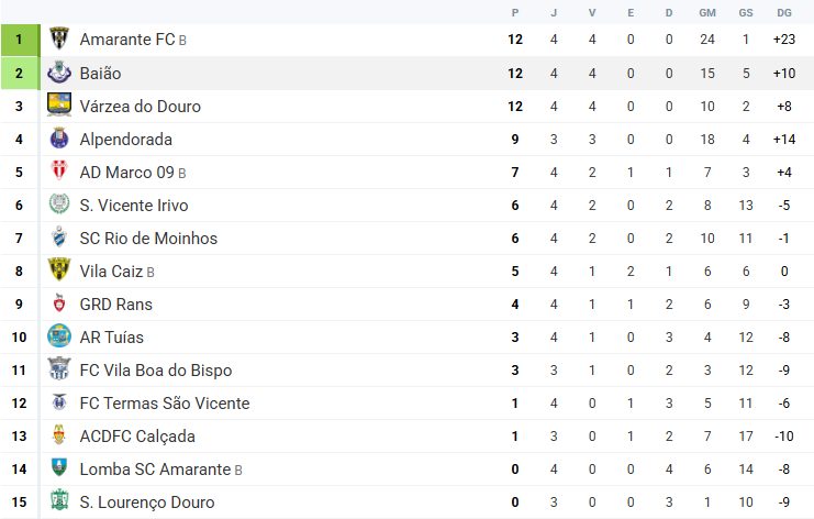 A Associação Desportiva de Baião continua em excelente forma na Série 2 da 2.ª Divisão de Sub-17 da AF Porto. A equipa orientada por Alcino Soares venceu todos os quatro jogos disputados até ao momento e partilha a liderança da classificação com o Amarante FC ‘B’ e a ADC Várzea do Douro.