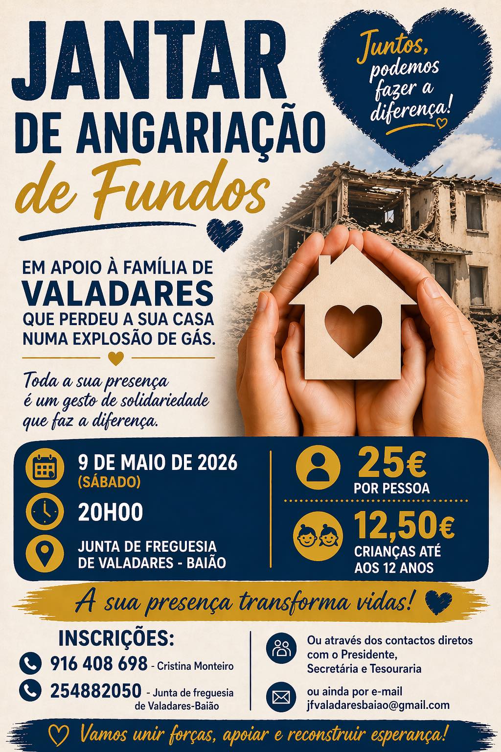 Realiza-se no dia 9 de maio, às 20h00, um jantar solidário para angariação de fundos destinado à família de Valadares que perdeu a sua casa numa explosão de gás.