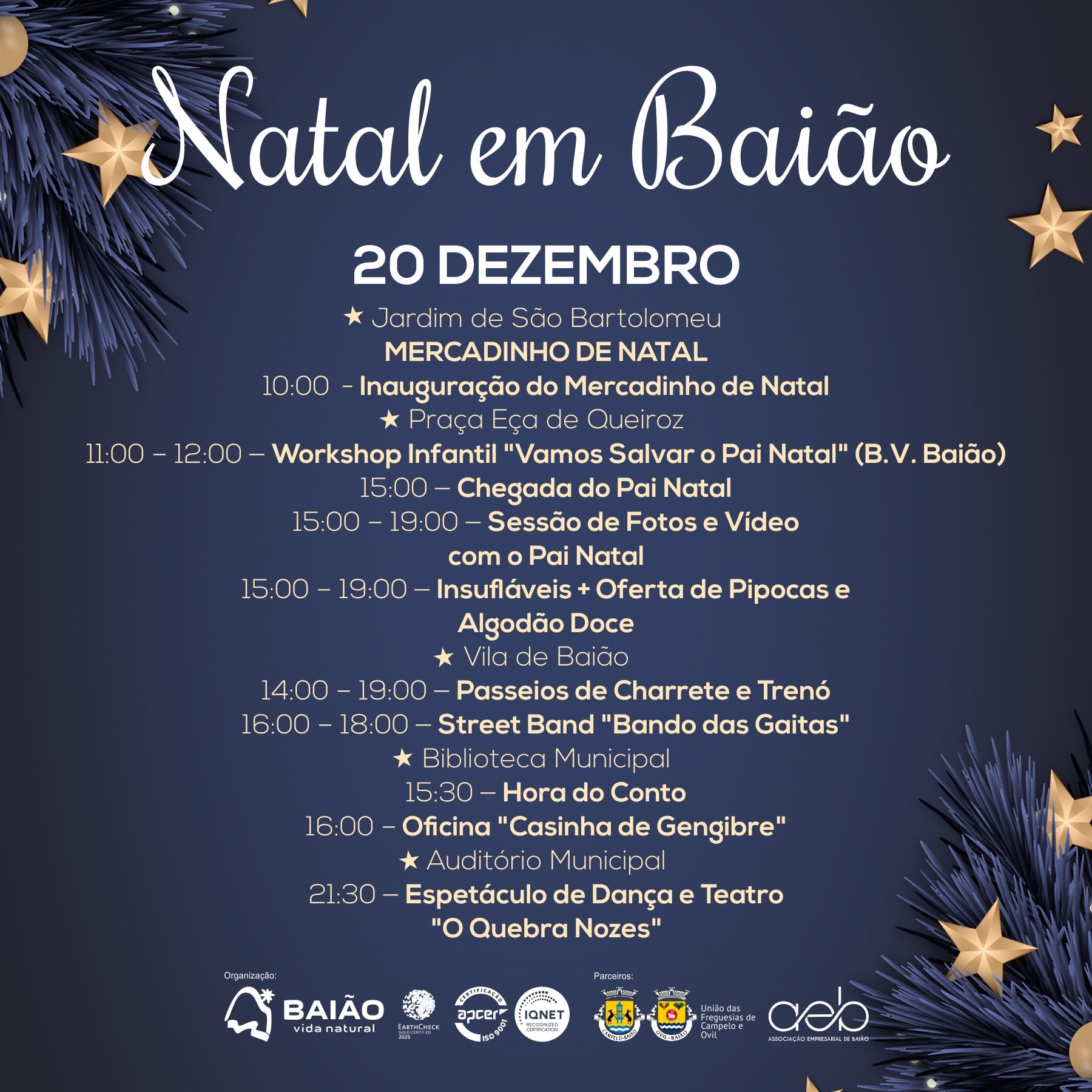 A programação inclui diversas atividades para toda a família. No sábado, pelas 11h00, realiza-se o workshop de primeiros socorros “Vamos Salvar o Pai Natal”, uma iniciativa dos Bombeiros Voluntários de Baião, especialmente dirigida aos mais pequenos.