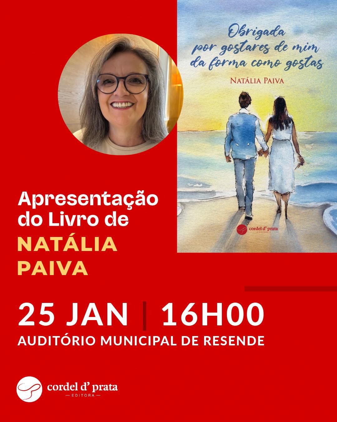 O Auditório Municipal de Resende recebe, no próximo dia 25 de janeiro, às 16h00, a apresentação do livro de Natália Paiva, residente em Resende, intitulado “Obrigada por gostares de mim da forma como gostas”, publicado pela Cordel d’ Prata Editora.