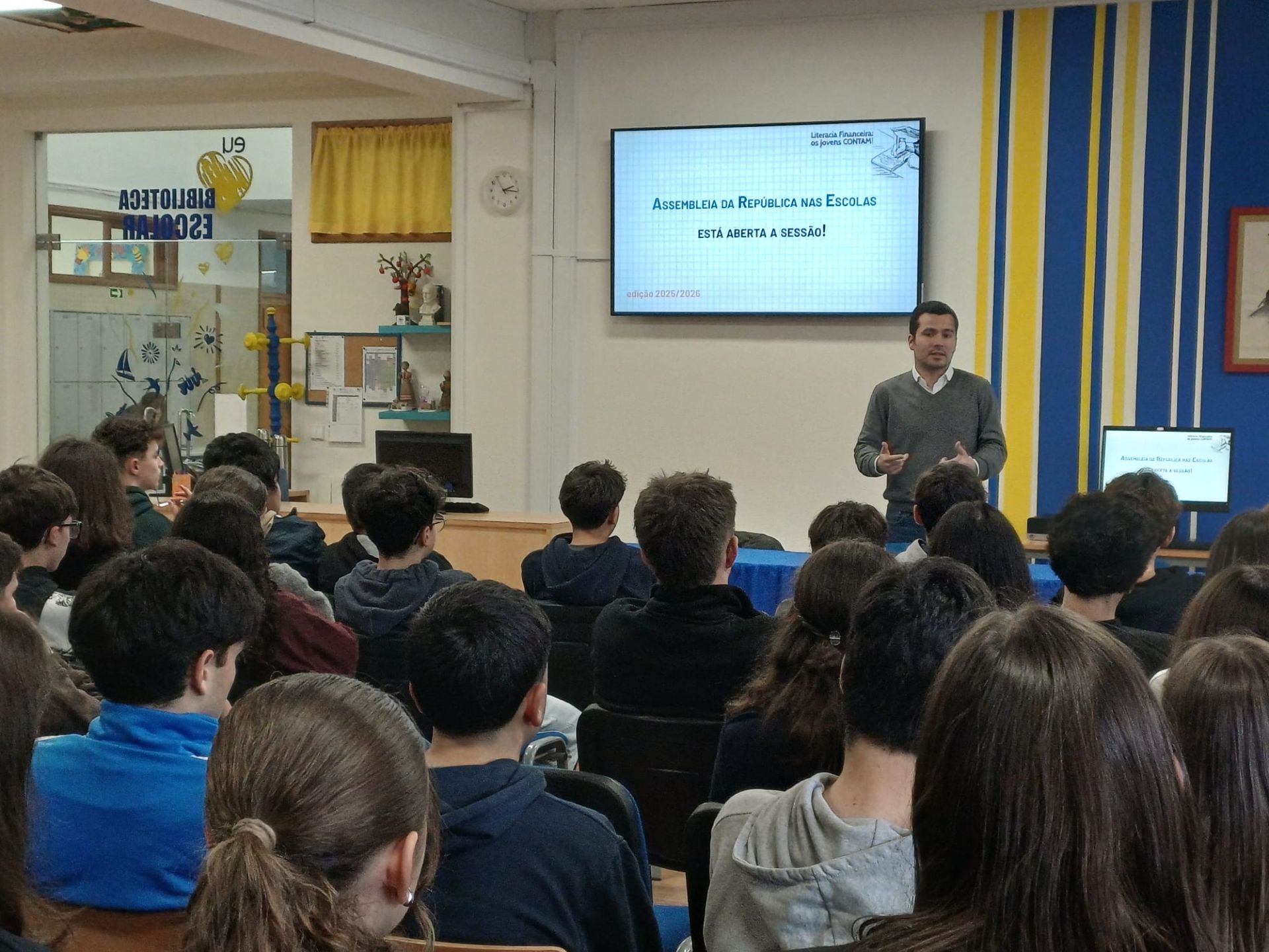 A sessão incluiu um momento de diálogo com os alunos, que colocaram questões diversificadas e pertinentes, abordando temas como a rotina diária de um deputado, o papel da política na sociedade contemporânea e a política de imigração promovida pelo atual governo.